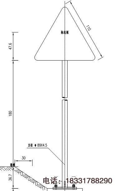 百分之八十以上的單柱式交通標志都是采用鋼管89mm制作,采用熱侵鍍鋅處理,常規尺寸立柱直徑φ89mm*厚度4.5mm*高度3000mm,基礎法蘭盤400mm*400mm*10mm,地腳螺栓M20*L=710mm。其他常見尺寸有φ76、114、121、140、152、165、180、194、219等都是單柱式標志桿的鋼管直徑,高度則根據公路規劃測量高度情況而定。一套標志桿是由立柱、底座法蘭盤、基礎法蘭盤、底座加勁肋、地腳螺栓、螺母、標志牌、抱箍、滑動槽、反光膜等材料組裝而成,基礎挖坑采用混凝土澆筑,一般5-7天則可安裝。